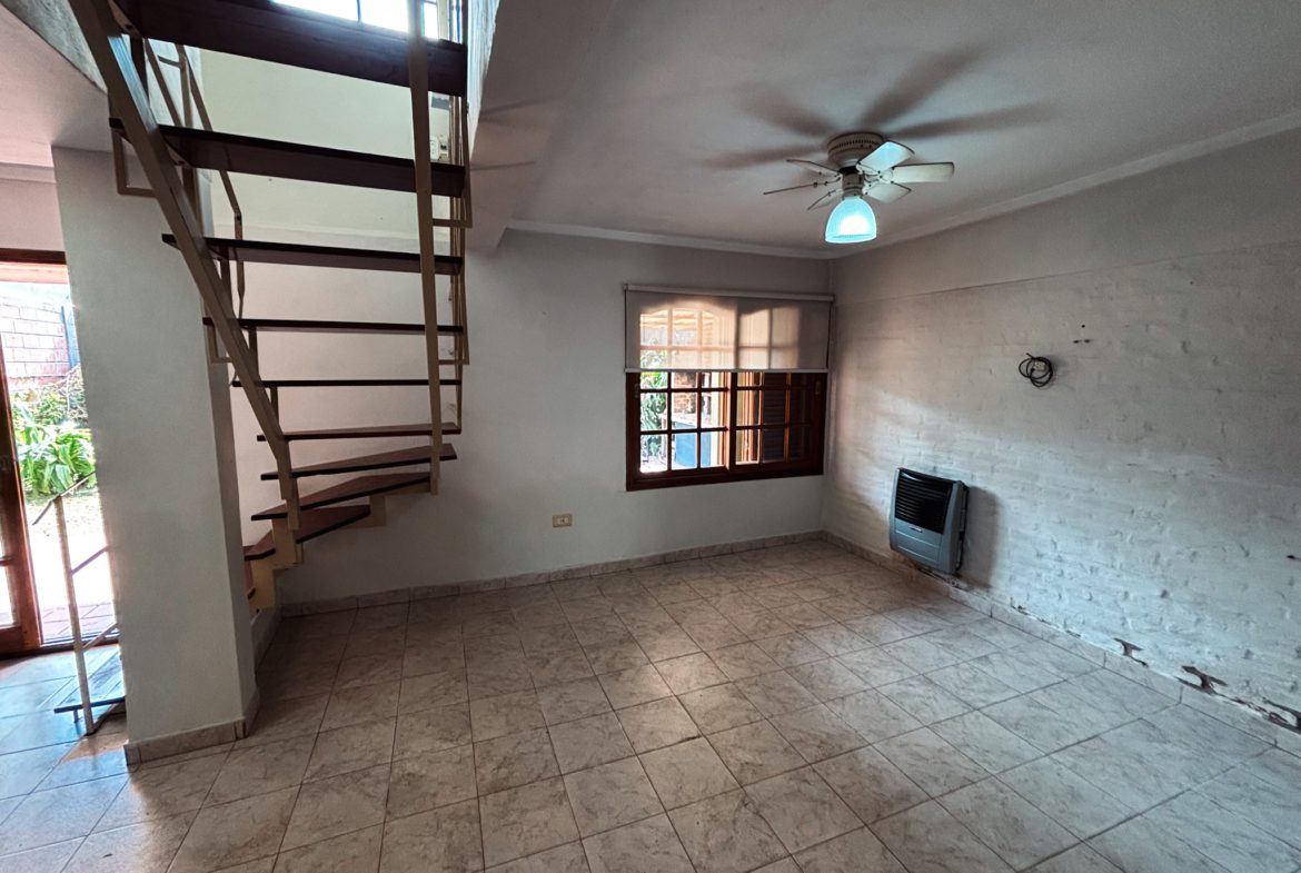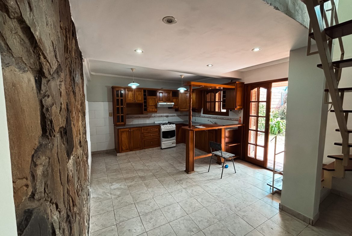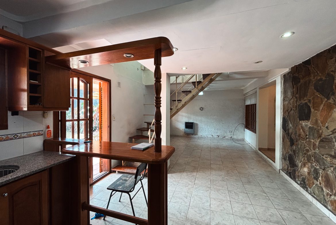 Casa en excelente estado de conservación y funcionamiento; al ingresar nos encontramos con la cochera para dos autos y luego pasamos al acceso de la vivienda. Al entrar nos encontramos con un pasillo distribuidor, a su izquierda tenemos el living, luego un baño completo con ante baño y al finalizar pasamos al comedor con una cocina integrada con un desayunador. Ambos ambientes dan a la galería semicubierta que abre al parque con parrilla.